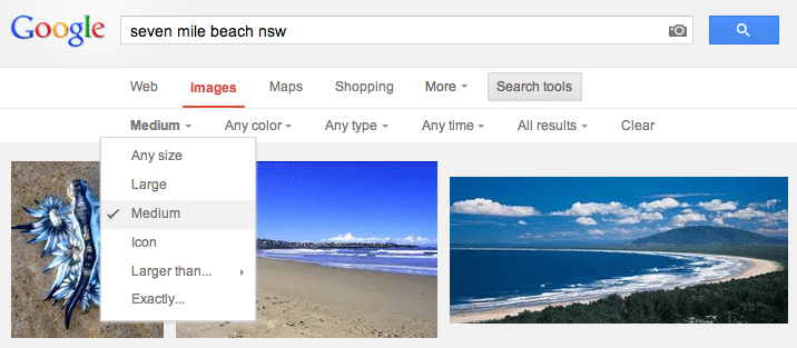 3. Click on ‘Search tools’ on the right under the search box, then click on the ‘Any size’ link that appears at the left side of the second row of links. This shows a dropdown list that enables you to narrow your search for images of a particular size.